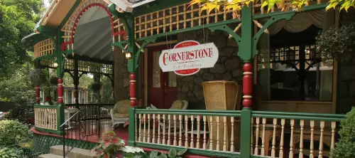 Guest room featuring king bed with a breakfast tray and writing desk with chair in nook with windows